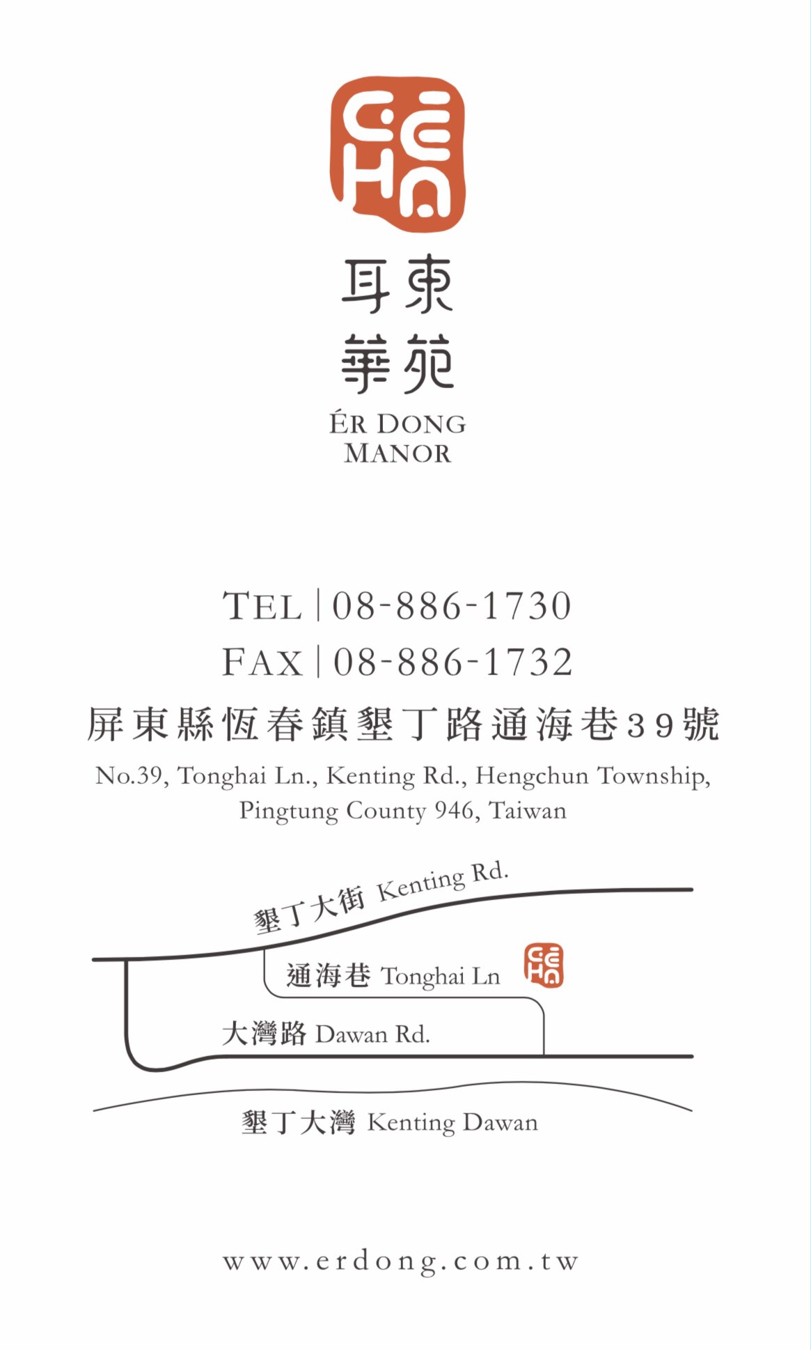 - 從左營高鐵站可搭乘中南客運、高雄屏東聯營的《墾丁快線》抵達墾丁,乘至【墾丁派出所站】下車,往回走徒步約2分鐘,左轉進入通海巷內後,直行到底再左轉,即可抵達耳東華苑渡假會館。【墾丁快線交通時刻表】